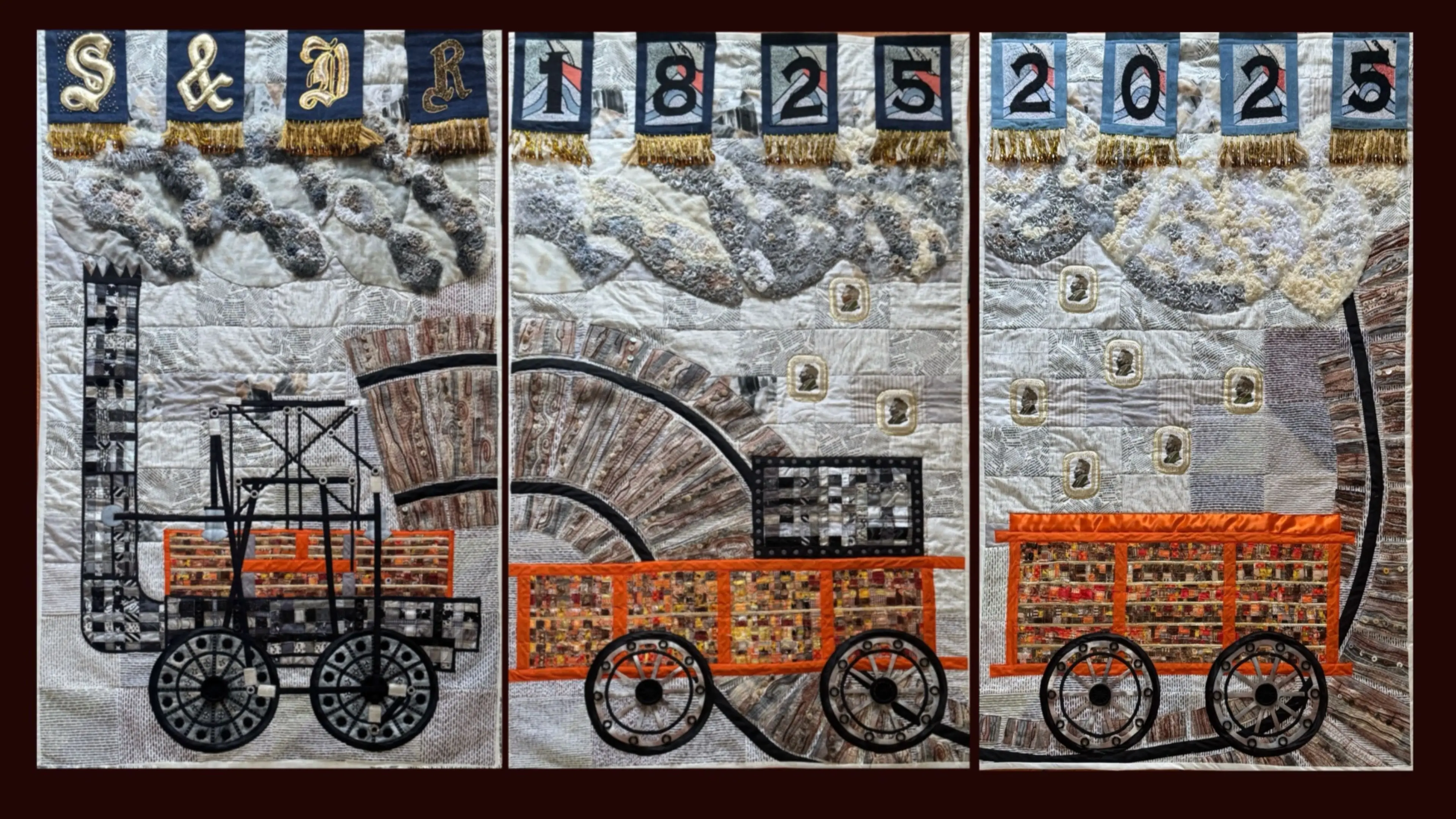 The Locomotion No.1 Triptych is a vibrant collaborative textile artwork inspired by Locomotion No.1, the pioneering steam locomotive built by George and Robert Stephenson for the Stockton & Darlington Railway. Conceived and crafted by members of Darlington Stitch and Create, this project began in December 2023 and reached completion in July 2025.